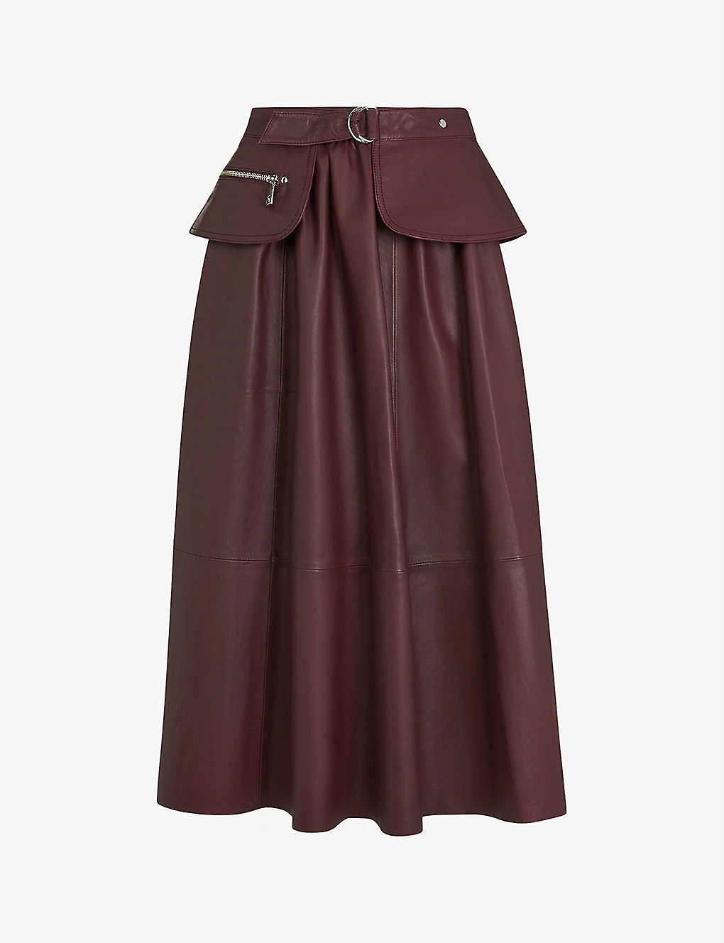 - Midi length, high-waisted, A-line silhouette, gathered, voluminous, panelled construction, matching waist belt with peplum and zip pocket, silver-tone hardware