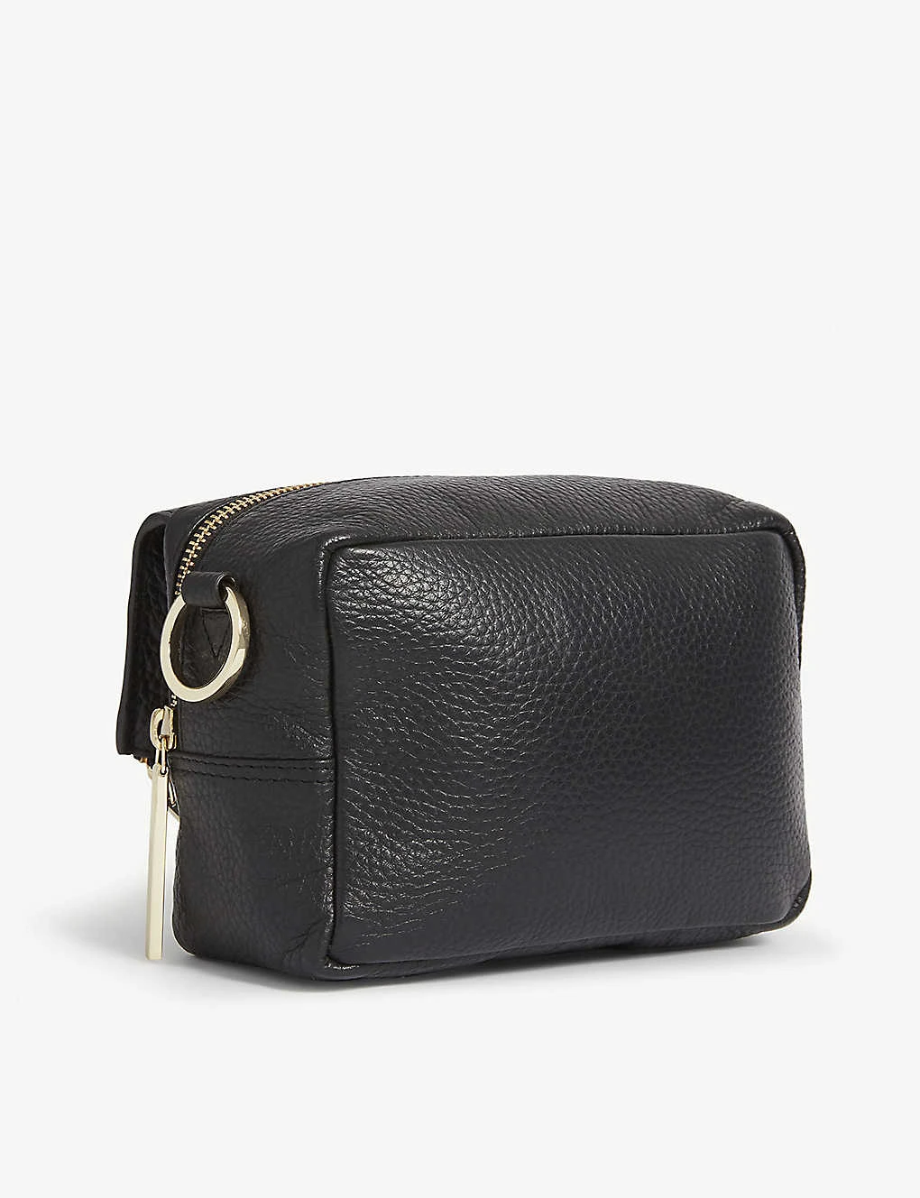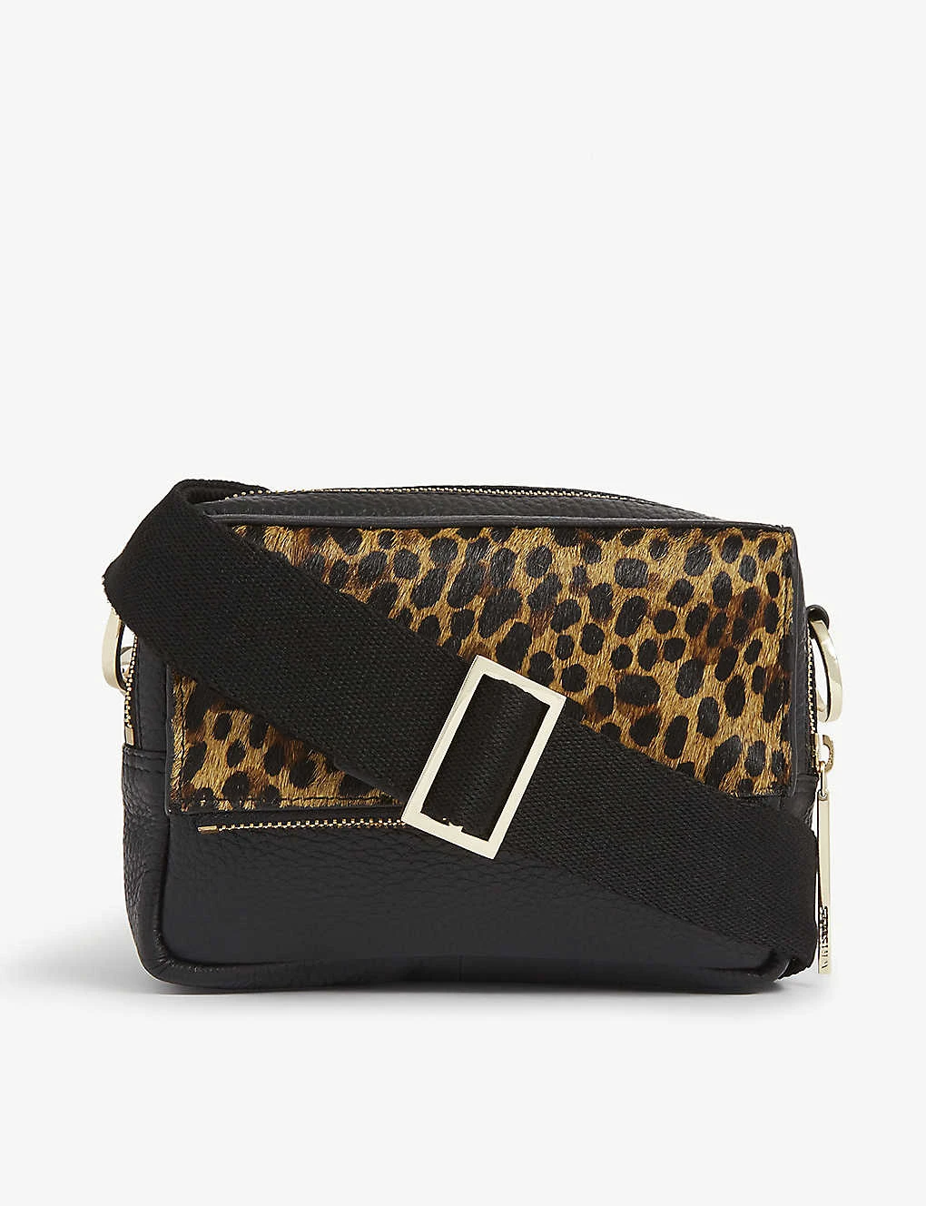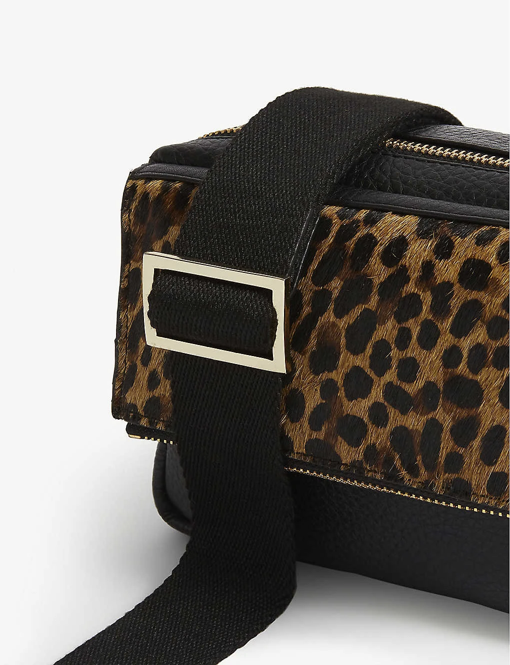 Adjustable and detachable woven strap, external flap zip pocket, pebbled, leopard-printed, branded zips, gold-tone hardware