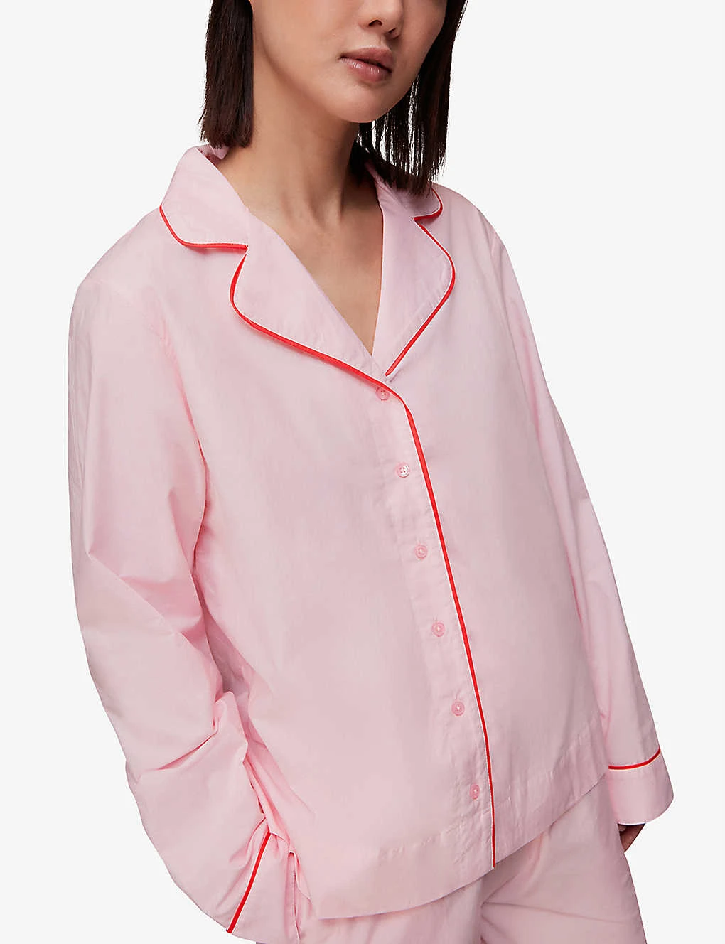 - Revere collar, long sleeves, buttoned cuffs, contrast piping