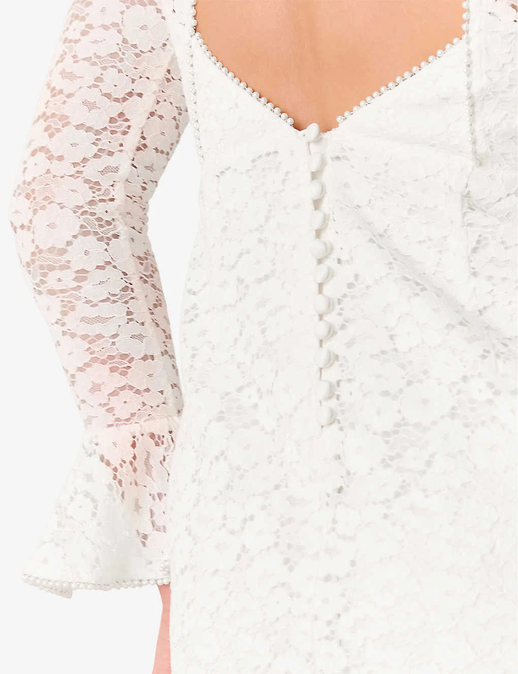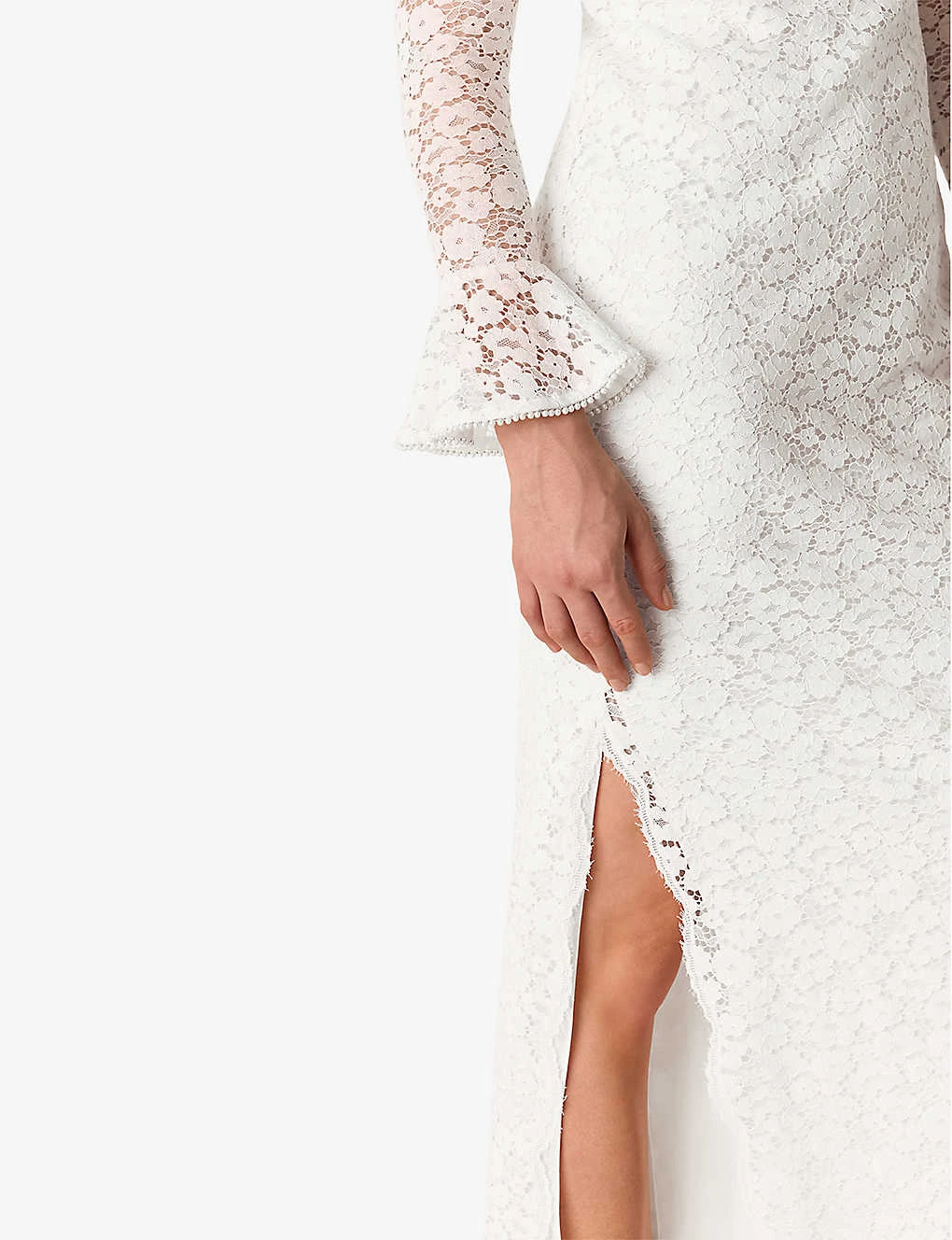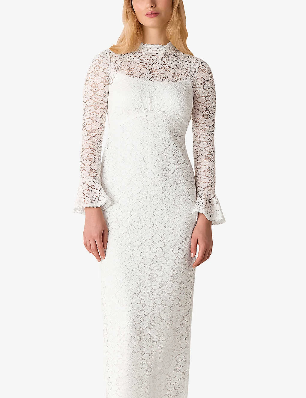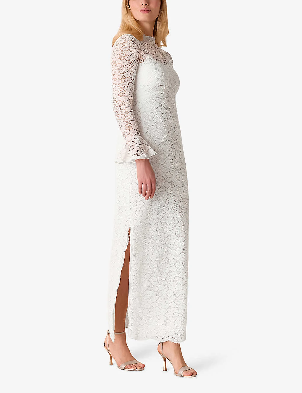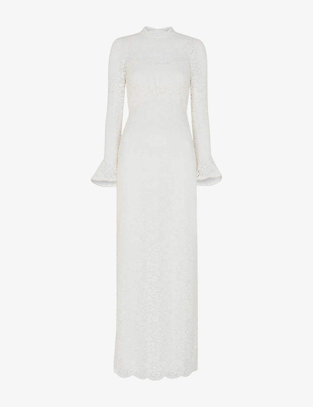 - Maxi length, slim fit, high neck, long sleeves, fluted cuffs, cami lining, embellished trims, open back, split at side