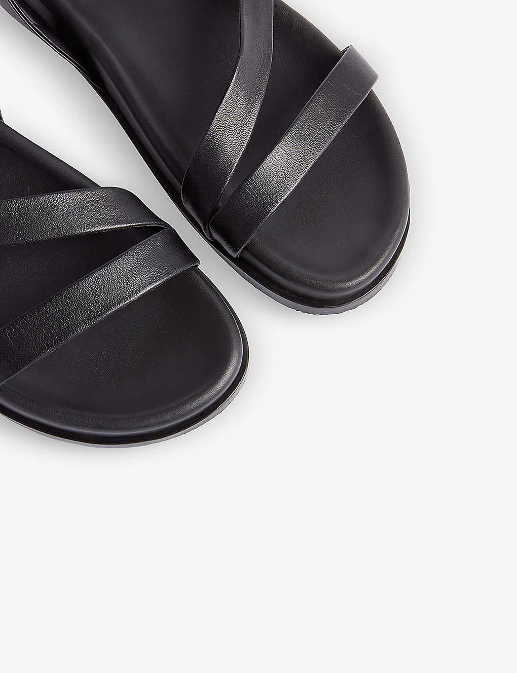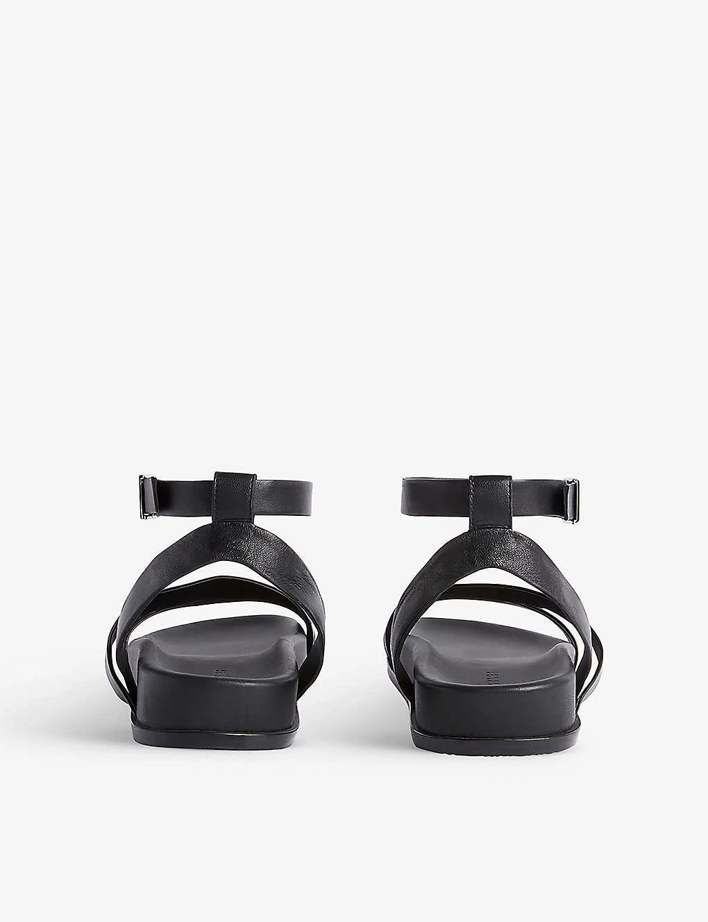 - Round toe, deep footbed, asymmetric foot straps, silver-toned hardware