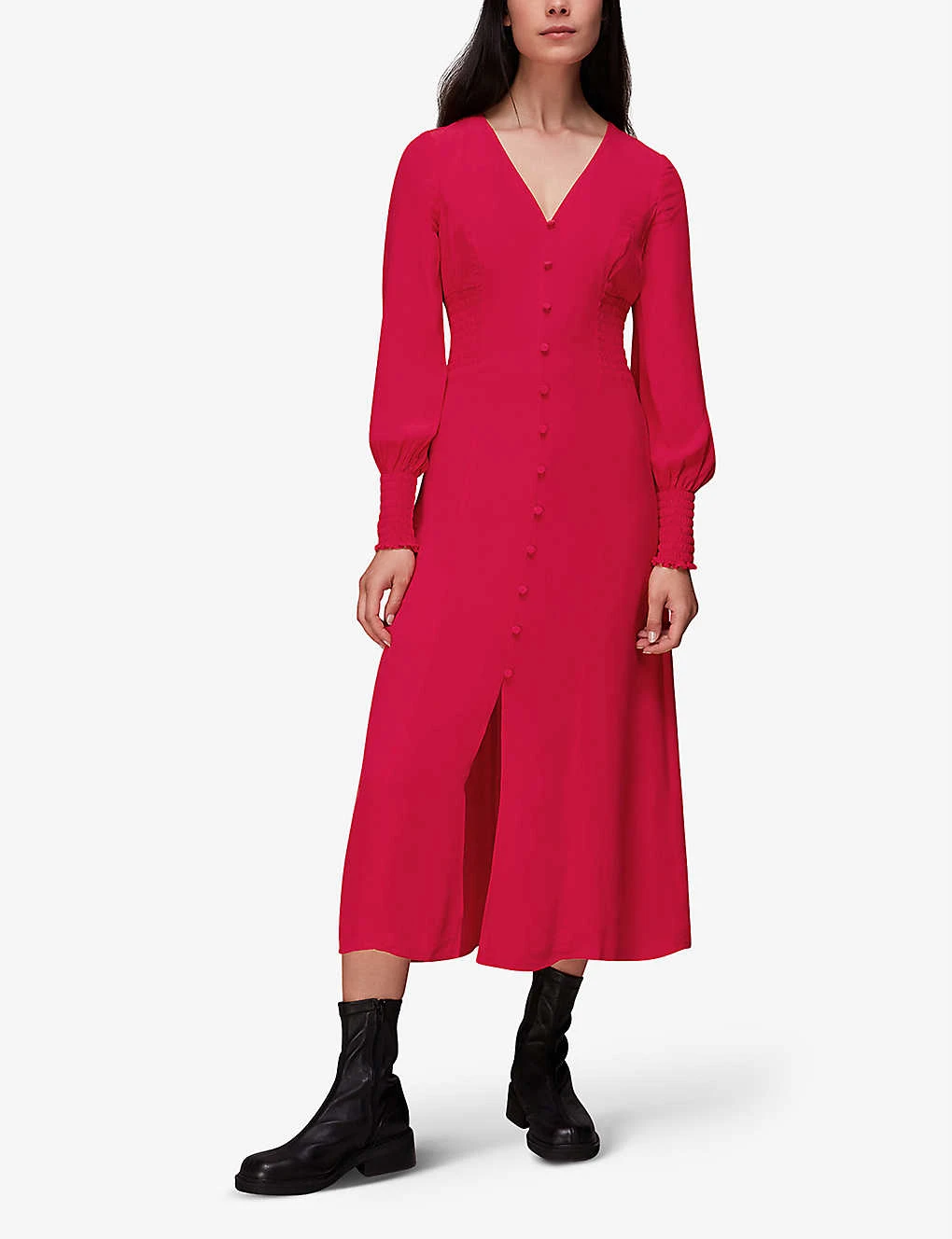 - V-neck, blouson sleeves, shirred cuffs and waist, buttons at front, midi skirt, split at front hem