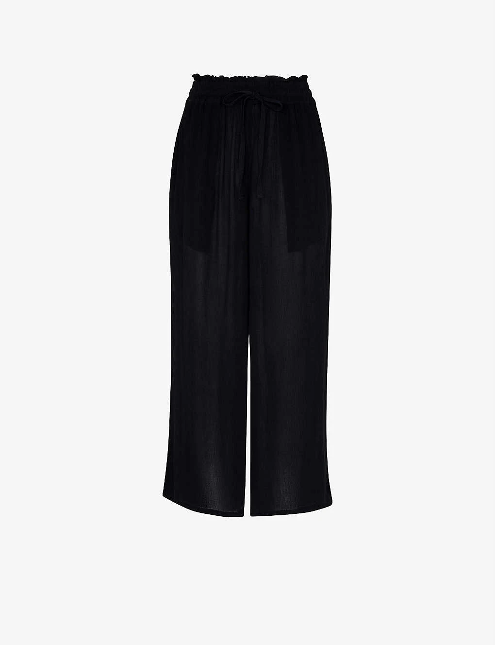 - Relaxed fit, cropped length, elasticated waist, high rise, wide leg, tie-waist detail, frill detail at waistband