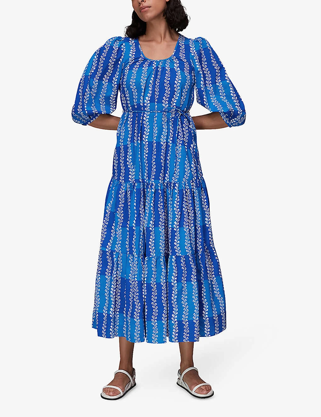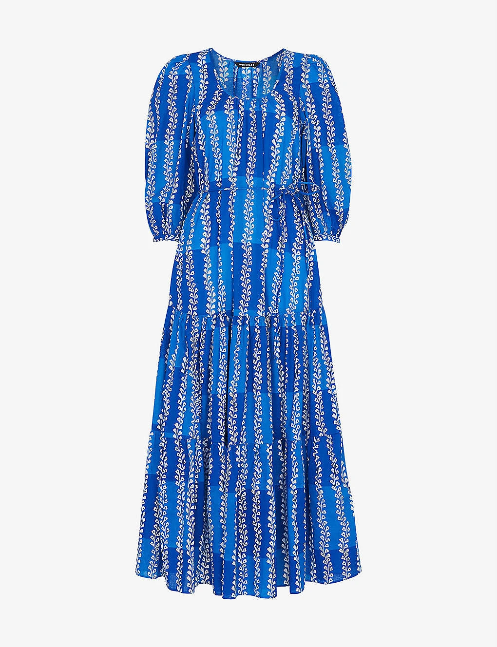 Whistles Leaf-print Puffed-sleeve Organic-cotton Midi Dress