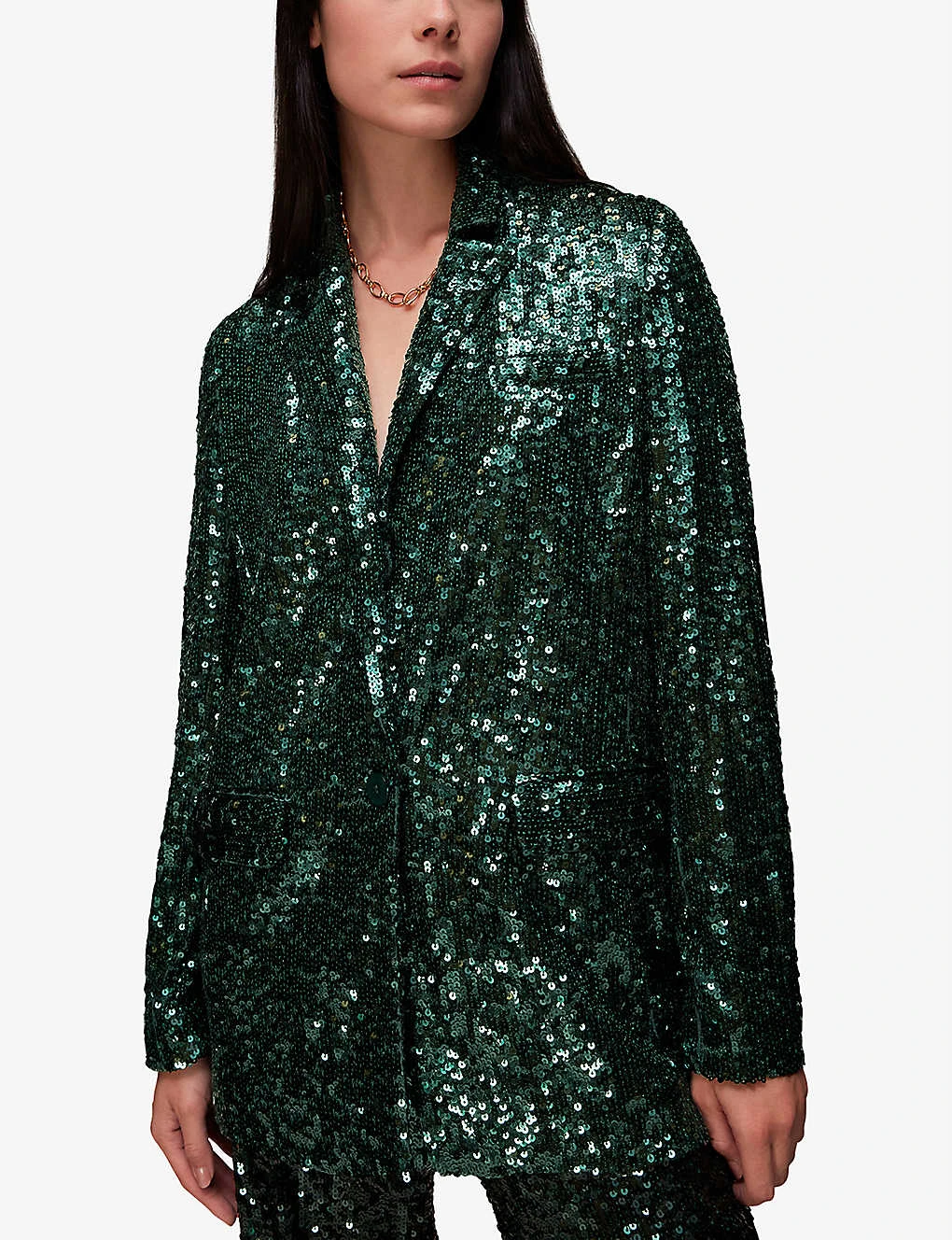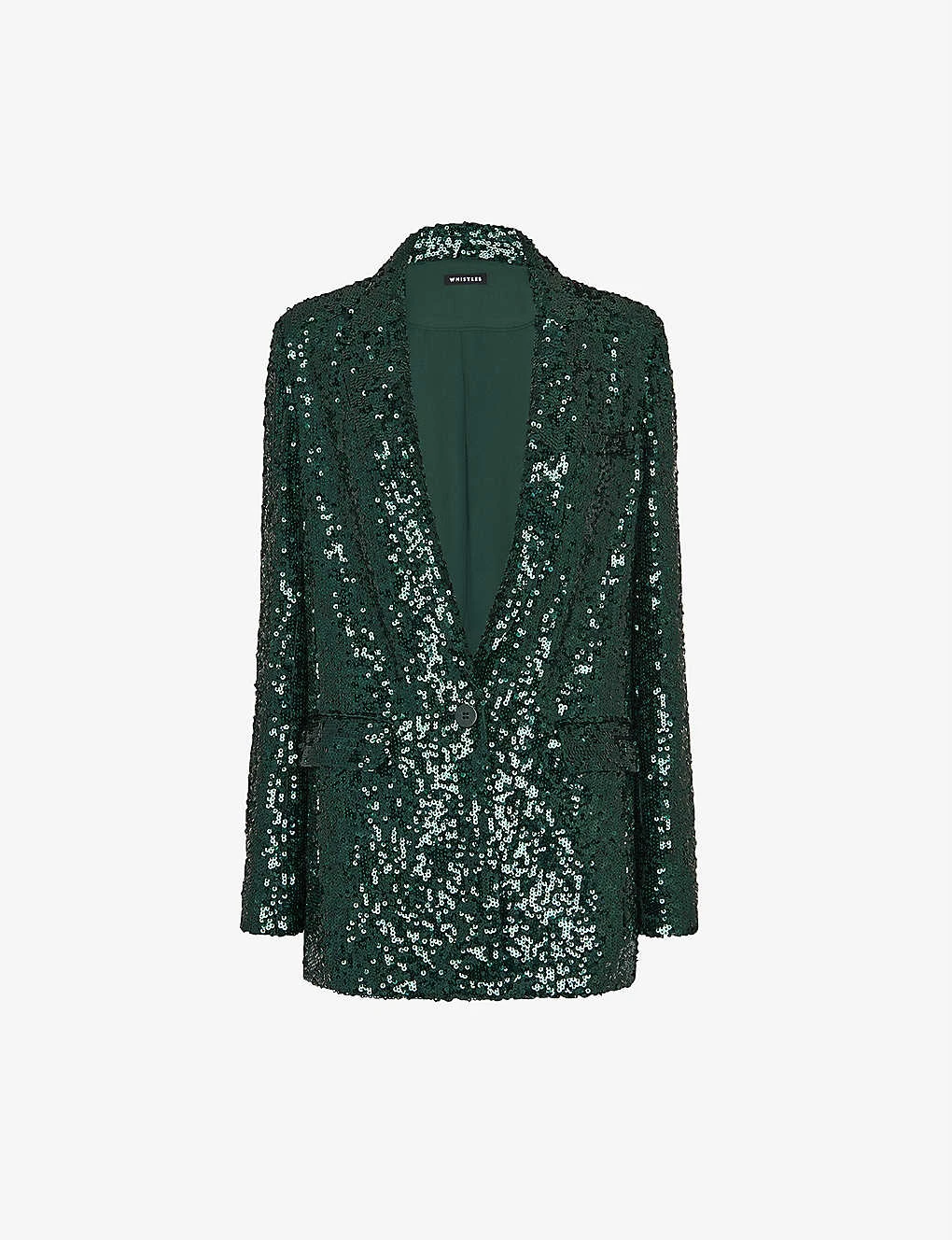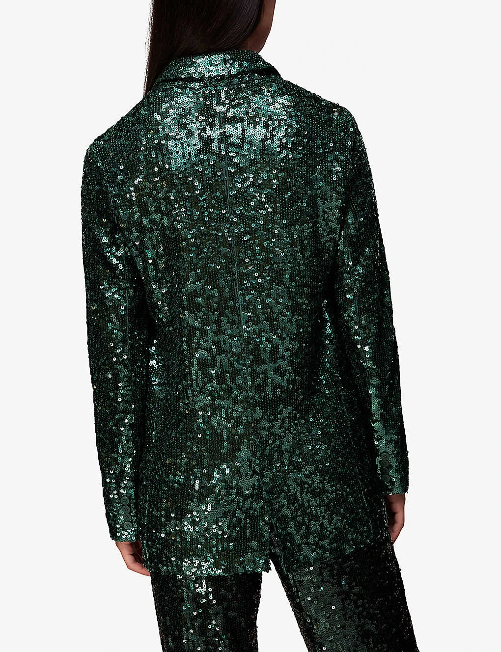 - Relaxed fit, notched lapels, single breasted, two flap pockets at front. all-over sequins, single vent at back