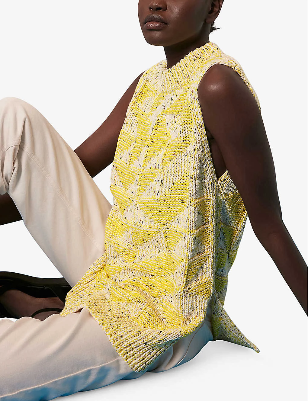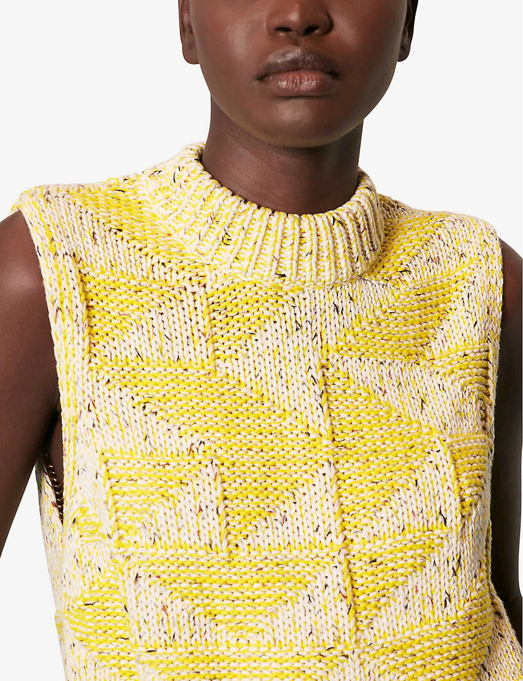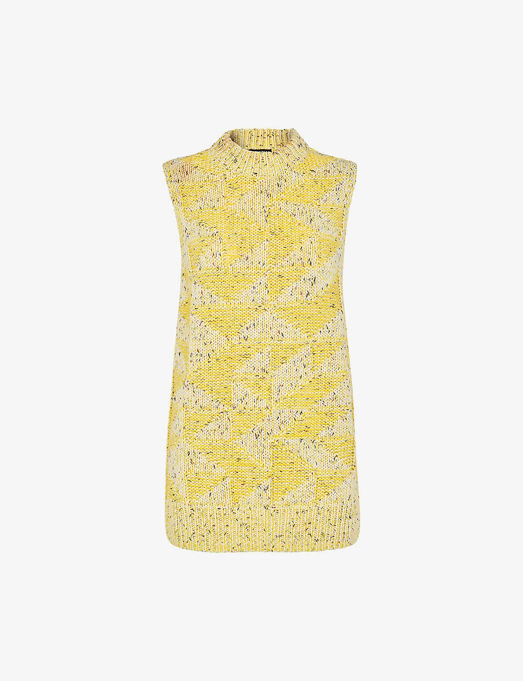 - Round neck, ribbed neck, sleeveless, regular-fit, intarsia pattern, chunky knit, tonal stitching