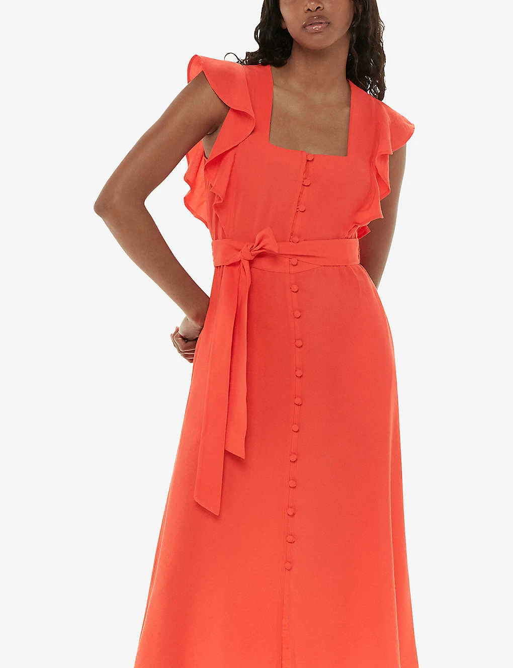 - Square neck, frill-sleeve, button-down fastening at the centre, self-tie belt at the waist, midi length